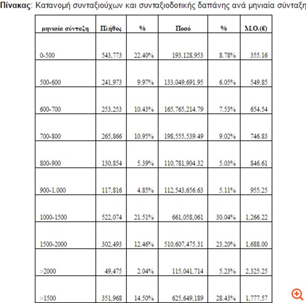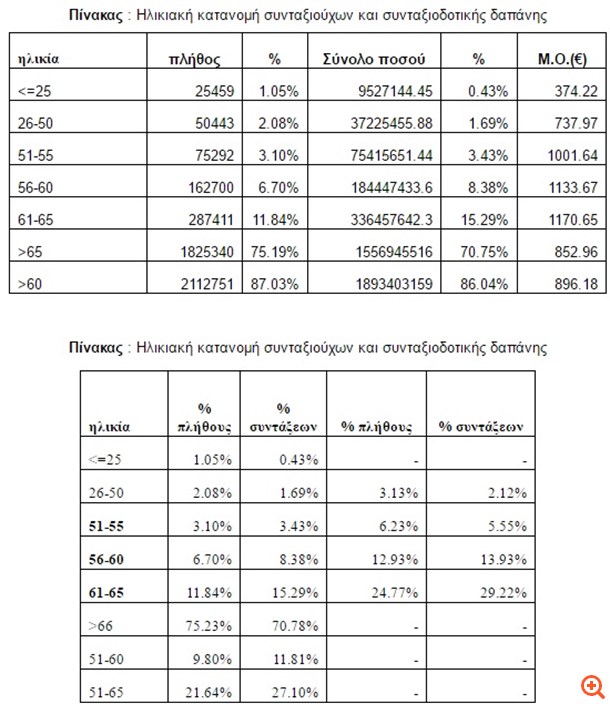 Στον παρακάτω πίνακα παρουσιάζεται η ηλικιακή σύνθεση των συνταξιούχων (γήρατος και θανάτου) και των απολαβών τους.